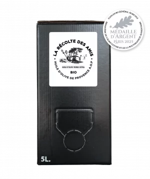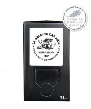 Retrouvez notre Fruité vert Aglandau BIO AOP , herbacé, puissant, légèrement poivré, disponible en 50CL, 1L, 3L et 5L,  médaillé or au concours national de Nyons des huiles d’olive en appellation d’origine protégées 2024…